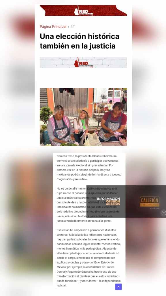 Por la izquierda: La imagen de Dannaly Argumedo, Candidata a Magistrada en Materia Civil Estado de México, Región Toluca, apareció ayer en la portada principal de la página web Red Sheinbaum ( redsheinbaum.org ) lo que llamó mucho la atención en ciertos sectores, pues podría entenderse como un espaldarazo de la estructura o bien que forma parte de los nombres que van en los acordeones de la Cuarta Transformación.