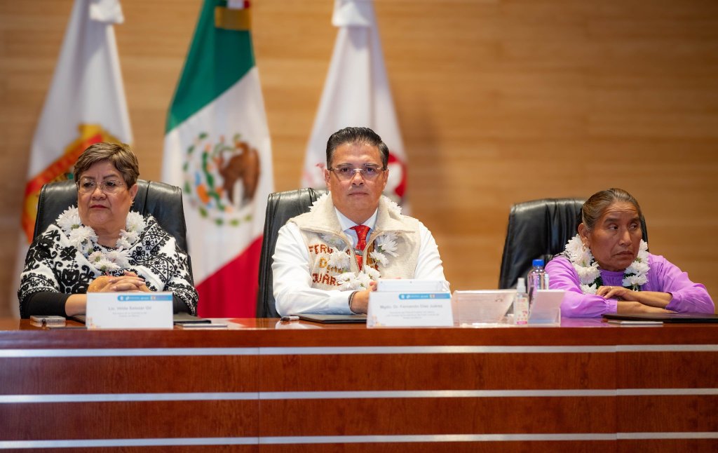 En el Salón de Plenos Alterno, acompañado por la Secretaria de la Contraloría del Poder Ejecutivo estatal, Hilda Salazar Gil, y Leticia Mejía García, Presidenta de la Comisión legislativa de Asuntos Indígenas de la LXII Legislatura estatal, el Presidente Díaz Juárez afirmó que hoy se dio un paso a una justicia intercultural construida desde la escucha activa y con sentido humano.