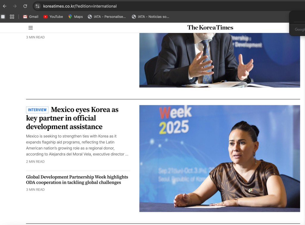 En su visita a Corea, la prensa destacó que México busca fortalecer los lazos con esa nación, al tiempo que amplía sus programas de ayuda insignia, lo que refleja el creciente papel de la nación latinoamericana como donante regional, esto en una entrevista precisamente a Alejandra del Moral Vela, directora ejecutiva de la Agencia Mexicana de Cooperación Internacional para el Desarrollo (AMEXCID).