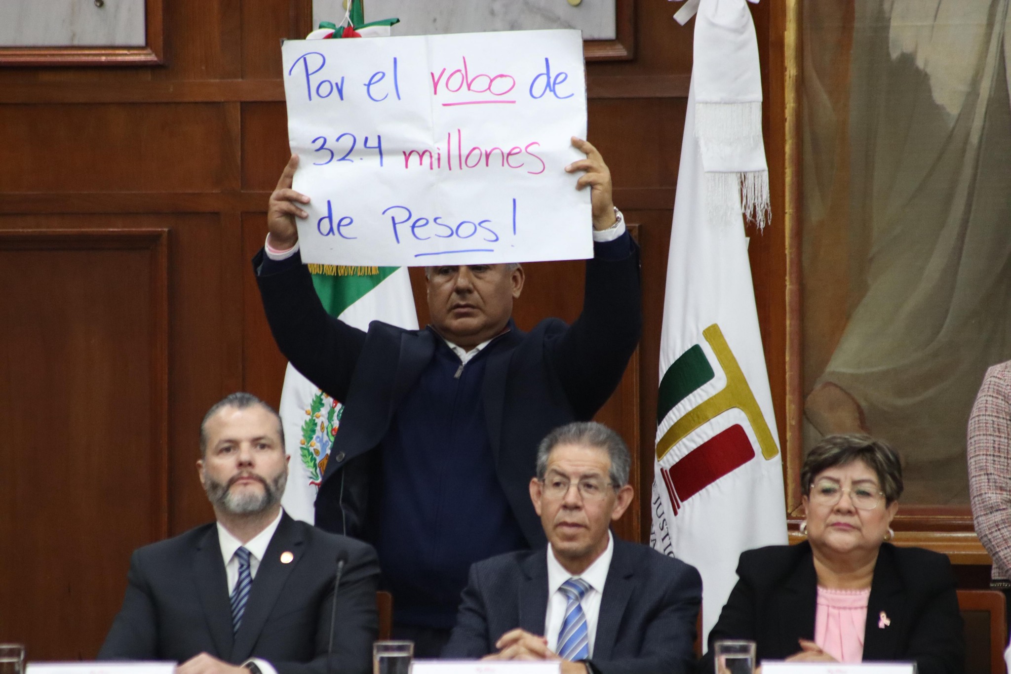 Cuando se desarrollaba el acto, en el Salón Benito Juárez de la Cámara de Diputados, el legislador de morena, quien se encontraba sentado en las primeras filas de invitados especiales, se dirigió al presidium, colocándose justo detrás del presidente del Tribunal de Justicia Administrativa, Gerardo Becker, desde donde exhibió una cartulina con las siguientes leyendas: