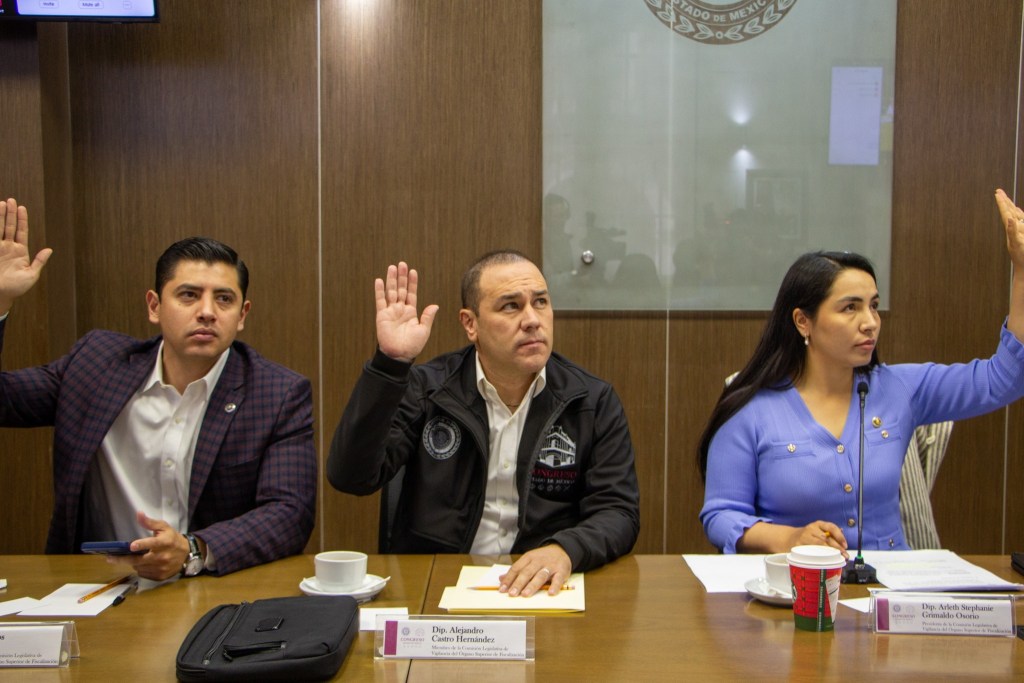 Por la izquierda: La Comisión de Vigilancia del Órgano Superior de Fiscalización del Estado de México (OSFEM), de la LXII Legislatura, presidida por la diputada Arleth Grimaldo Osorio (Morena), aprobó por unanimidad los dictámenes relativos a la Cuenta Pública 2024 del Poder Ejecutivo, de los organismos auxiliares y autónomos del estado, así como de los municipios y sus organismos descentralizados, al considerar que se presentó en cumplimiento de los mandatos constitucionales y legales aplicables.