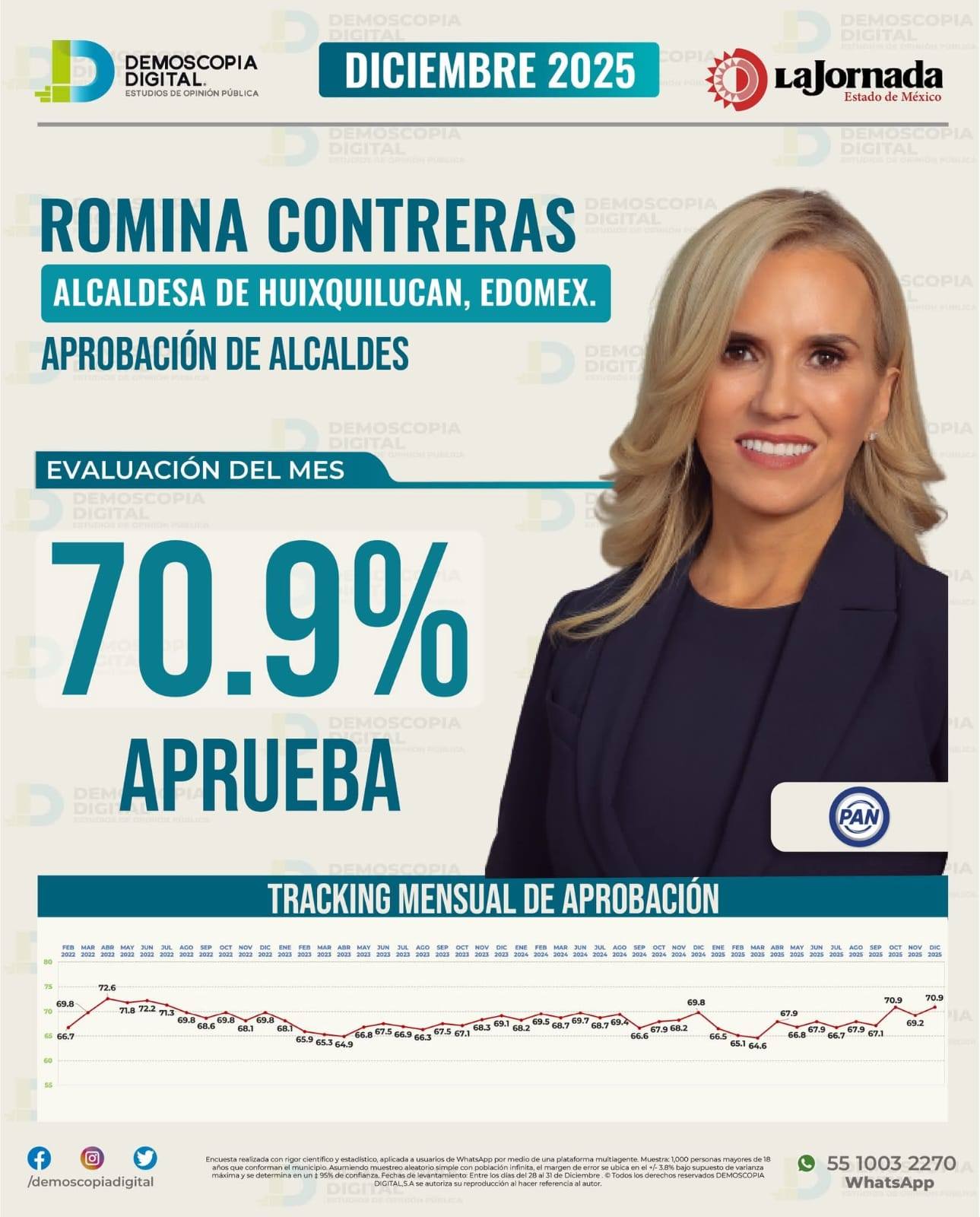 De acuerdo con la medición publicada en el referido medio informativo, Romina Contreras, la presidenta Municipal de Huixquilucan, obtuvo una aprobación al finalizar 2025, del 70.9 por ciento, la mayor en la entidad mexiquense.